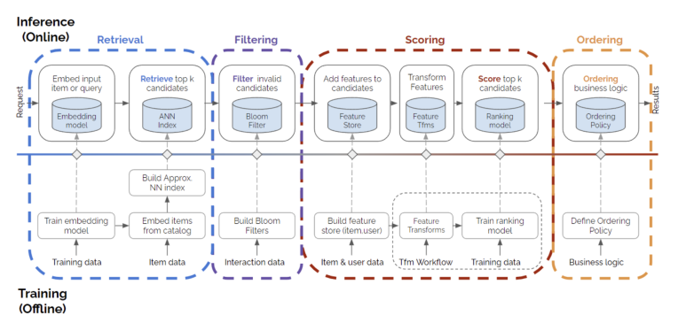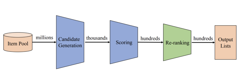 이렇게 구성할 경우 세 단계에서의 목표함수에 따라 알고리즘이 모두 다르게 설계될 수 있을 뿐더러, 각 단계에서 유지해야하는 latency 수준도 다르게 설정할 수 있다. 일반적으로 1번인 검색 결과를 생성하는 단계에서는 다른 단계에 비해 굉장히 낮은 수준의 latency를 유지해야한다. (유저의 사용성을 위해)