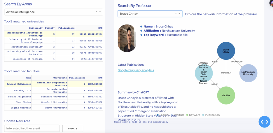 Database System: 전반적으로 DB와 친해지고 데이터베이스를 관리하는 방법에 대해 알려주는 과목이다. MySQL, Neo4j, MongoDB로 Non-relational DB까지 이용방법과 SQL, MongoDB Query Language, Cypher에 대해 익숙해질 수 있었다. 시험 총 3번, 프로그래밍 과제, 그리고 파이널 프로젝트가 있었고 특히 시험에서 쉽게 놓칠만한 중요한 부분들에 대해 한 번 더 꼬아둔 질문이 많아서 더 열심히 공부하게 되었다. 아주 쉬운 예로는 MySQL 쿼리에서 groupby, agg로 평균을 구하는 쿼리인데 데이터 상 Null이 있을 때 없을때 등을 감안하고 데이터 결과를 연산해야했다. Final project로는 대시보드를 만들어야했는데 MySQL, Neo4j, MongoDB를 모두 백엔드로 두고 여러 위젯을 만들어야했다. 대시보드 시나리오 구상부터 화면 기획, 데이터 연결 코드 등을 직접 작업해야해서 꽤 재밌게 했다. 도메인이 대학교 교수, 교수들의 연구활동, 대학 정보를 다루고 있어서 University Explorer 웹을 개발했다. CS-rankings와 같이 학생들이 원하는 분야를 설정하면 연구결과로 상위 매칭 대학들을 보여주고, 교수를 선택하면 교수와 관련된 연구분야, 논문 실적 그리고 네트워크로 연결된 다른 교수들까지 모두 보여준다. 이 과정에서 Extra-credit 활동으로 외부 데이터 확장을 하면 점수를 더 준다해서 욕심내서 SERP API로 Google Scholars 데이터와 OpenAI 로 ChatGPT 응답을 합쳐서 대시보드를 만들어 보여주었다.