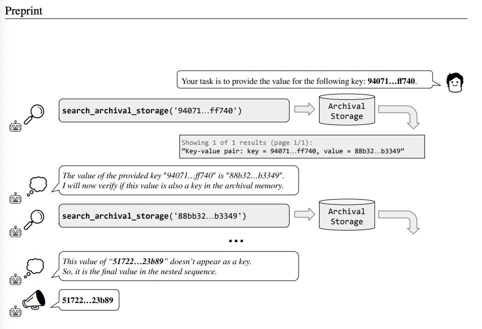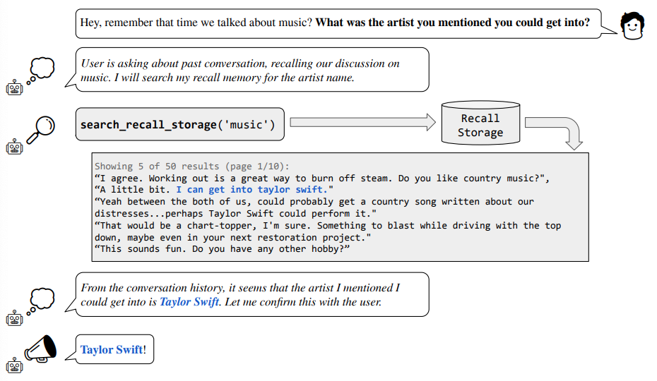 그리고 저장공간은 recall storage와 archival storage를 구분한다고 한다. recall storage는 유저와의 대화 내용들을 특정 쿼리 혹은 시간대에 맞추어 검색할 수 있는 구조로 되어있으며 archival storage는 앞서 반복적으로 이야기되는 context length 한계에 따른 정보들을 장기 기억처럼 담기 위해 read-write할 수 있는 database로 활용된다고 한다. Archival storage는 key-value 페어로 데이터를 저장하는 듯해 보였다. 단적인 예로는 recall storage는 대화 내용 전체를 그냥 로깅해놓는다면 archival storage는 생일: {날짜}, 취미: {취미}와 같이 정보를 기록해둔다.