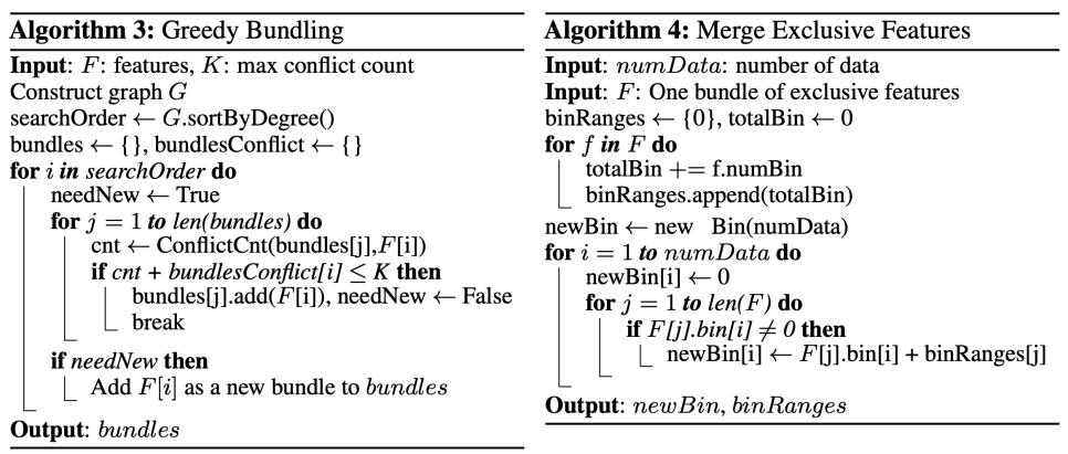 2. EFB - Exclusive Feature Bundling : 서로 배타적인 feature들만 골라 사용함으로써 dimension 줄임