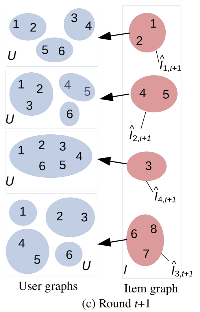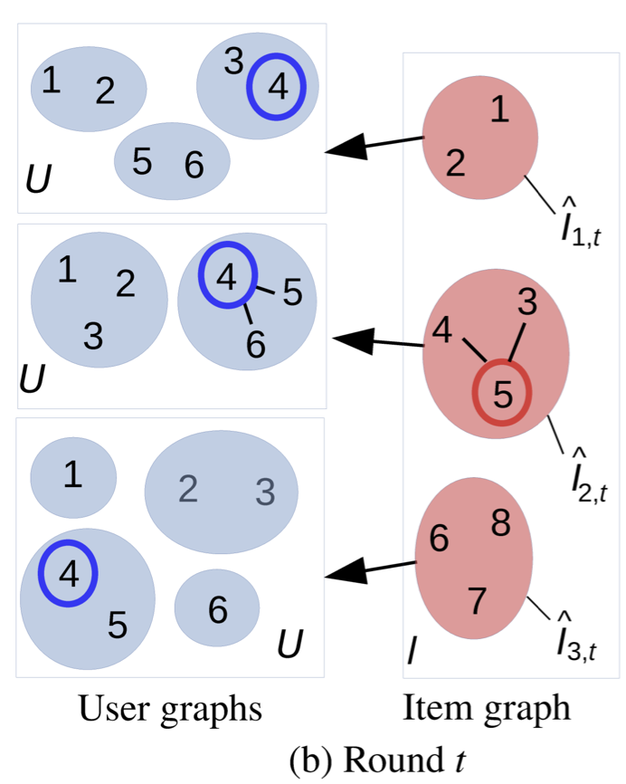 COFIBA 모델은 매 라운드에서 추천 결과를 결정해야하는 유저 i와 추천 가능한 아이템 리스트를 input받는다.